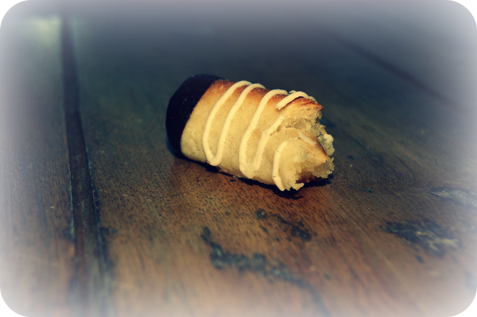 Når kagerne er kolde, dyppes enderne i smeltet chokolade og pyntes med en fin stribe glasur. Mine kransekager har fået et drys glimmer - det er jo kun nytår en gang om året ;)